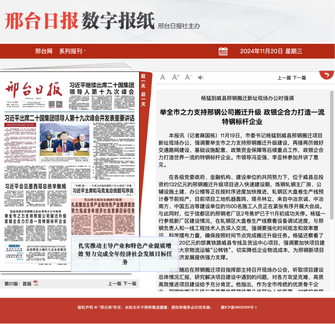 楊猛隨后在邢鋼搬遷項目指揮部主持召開現(xiàn)場辦公會,聽取項目建設(shè)總體情況匯報,研究解決項目建設(shè)中遇到的問題,對各方攻堅克難、高質(zhì)高效推進項目建設(shè)給予充分肯定。他指出,作為全市傳統(tǒng)的優(yōu)質(zhì)骨干企業(yè),邢鋼的搬遷升級與高質(zhì)量發(fā)展凝結(jié)著幾代邢臺人的夙愿,對維護發(fā)展穩(wěn)定大局、實現(xiàn)全市跨越趕超意義重大,全市上下要搶抓“百泉復涌”歷史新機遇,增強務實擔當?shù)呢熑胃泻头置氡貭幍木o迫感,搶抓黃金施工期,舉全市之力破解關(guān)鍵難題、強化要素保障,全力推動邢鋼新廠區(qū)盡快建成投產(chǎn)、老廠區(qū)按時關(guān)停。威縣要提高站位、統(tǒng)一思想,一鼓作氣推進服務保障工作,積極組織銀企對接、產(chǎn)業(yè)招商、產(chǎn)品推介等活動,引導形成全社會支持邢鋼發(fā)展的良好氛圍,切實放大邢鋼新廠輻射帶動效應,努力打造獨具特色的特鋼產(chǎn)業(yè)集群。各金融機構(gòu)要形成工作合力,創(chuàng)新金融產(chǎn)品,主動加強與企業(yè)對接服務,積極爭取上級金融機構(gòu)支持,為項目建設(shè)提供堅實保障。市直相關(guān)部門要積極對接項目建設(shè),提前介入、靠前服務,吃透用好各項有利政策,拿出幫助搬遷建設(shè)的硬政策硬舉措,形成推動后續(xù)發(fā)展的政策合力,把邢鋼打造成為我市新材料產(chǎn)業(yè)的強力支撐。