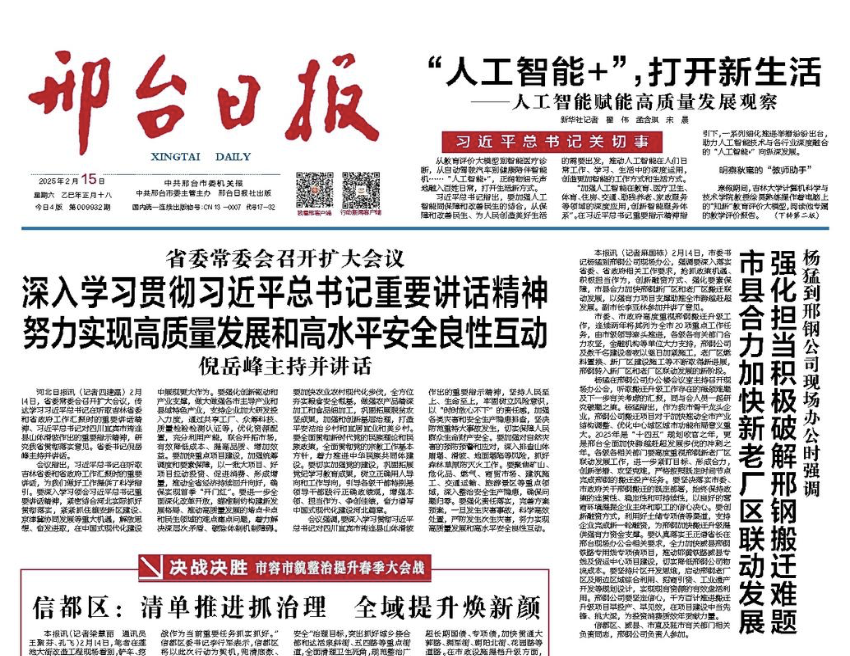 楊猛在邢鋼公司辦公樓會(huì)議室主持召開現(xiàn)場(chǎng)辦公會(huì),聽取搬遷升級(jí)工作存在的瓶頸難題及下一步有關(guān)考慮的匯報(bào),同與會(huì)人員一起研究破題之策。楊猛指出,作為我市骨干龍頭企業(yè),邢鋼公司搬遷項(xiàng)目對(duì)于加快推動(dòng)全市產(chǎn)業(yè)結(jié)構(gòu)調(diào)整、優(yōu)化中心城區(qū)城市功能布局意義重大。2025年是“十四五”規(guī)劃收官之年,更是邢臺(tái)全面加快跨越趕超發(fā)展步伐的沖刺之年。各級(jí)各相關(guān)部門要高度重視邢鋼新老廠區(qū)聯(lián)動(dòng)發(fā)展工作,進(jìn)一步緊盯目標(biāo)、形成合力,創(chuàng)新舉措、攻堅(jiān)克難,嚴(yán)格按照既定時(shí)間節(jié)點(diǎn)完成邢鋼的搬遷投產(chǎn)任務(wù)。要堅(jiān)決落實(shí)市委、市政府關(guān)于邢鋼搬遷的既定部署,始終保持政策的連貫性、穩(wěn)定性和可持續(xù)性,以良好的營(yíng)商環(huán)境提振企業(yè)主體和職工的信心決心。要?jiǎng)?chuàng)新融資方式,利用好土儲(chǔ)專項(xiàng)債等渠道,支持企業(yè)完成新一輪融資,為邢鋼加快搬遷升級(jí)提供強(qiáng)有力資金支撐。要認(rèn)真落實(shí)王正譜省長(zhǎng)在邢臺(tái)現(xiàn)場(chǎng)辦公會(huì)相關(guān)要求,全力加快威縣邢鋼鐵路專用線專項(xiàng)債項(xiàng)目,推動(dòng)邯黃鐵路威縣專線及貨運(yùn)中心項(xiàng)目建設(shè),切實(shí)降低邢鋼公司物流成本。要堅(jiān)持片區(qū)開發(fā)思維,啟動(dòng)邢鋼老廠區(qū)及周邊區(qū)域綜合利用、招商引資、工業(yè)遺產(chǎn)開發(fā)等規(guī)劃設(shè)計(jì),實(shí)現(xiàn)現(xiàn)有資源的有效盤活利用。邢鋼公司要堅(jiān)定信心,千方百計(jì)推進(jìn)搬遷升級(jí)項(xiàng)目早投產(chǎn)、早見效,在項(xiàng)目建設(shè)中當(dāng)先鋒、挑大梁,為投資消費(fèi)質(zhì)效年貢獻(xiàn)力量。