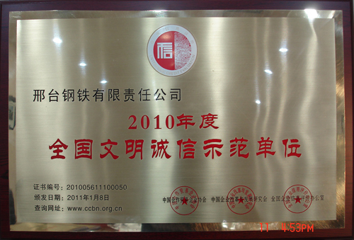 邢鋼榮獲2010年度“全國文明誠信示范單位” 稱號